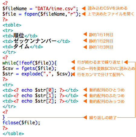 エクセルをCSV形式でサーバに置いておき、PHPがそれを読み込み表示すると言ったプログラムだ。
